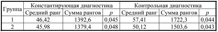Для статистико-математического анализа был использован пакет программ STATISTICA 6.0, в котором был рассчитан U-критерий Манна — Уитни. Это статистический критерий, который используется для оценки наличия и выраженности различий по какому-либо признаку между двумя независимыми выборками. Он является одним из самых эффективных тестов для выявления различий между малыми выборками. Критический уровень значимости при проверке статистических гипотез (p) в данном исследовании принимали равным 0,05.