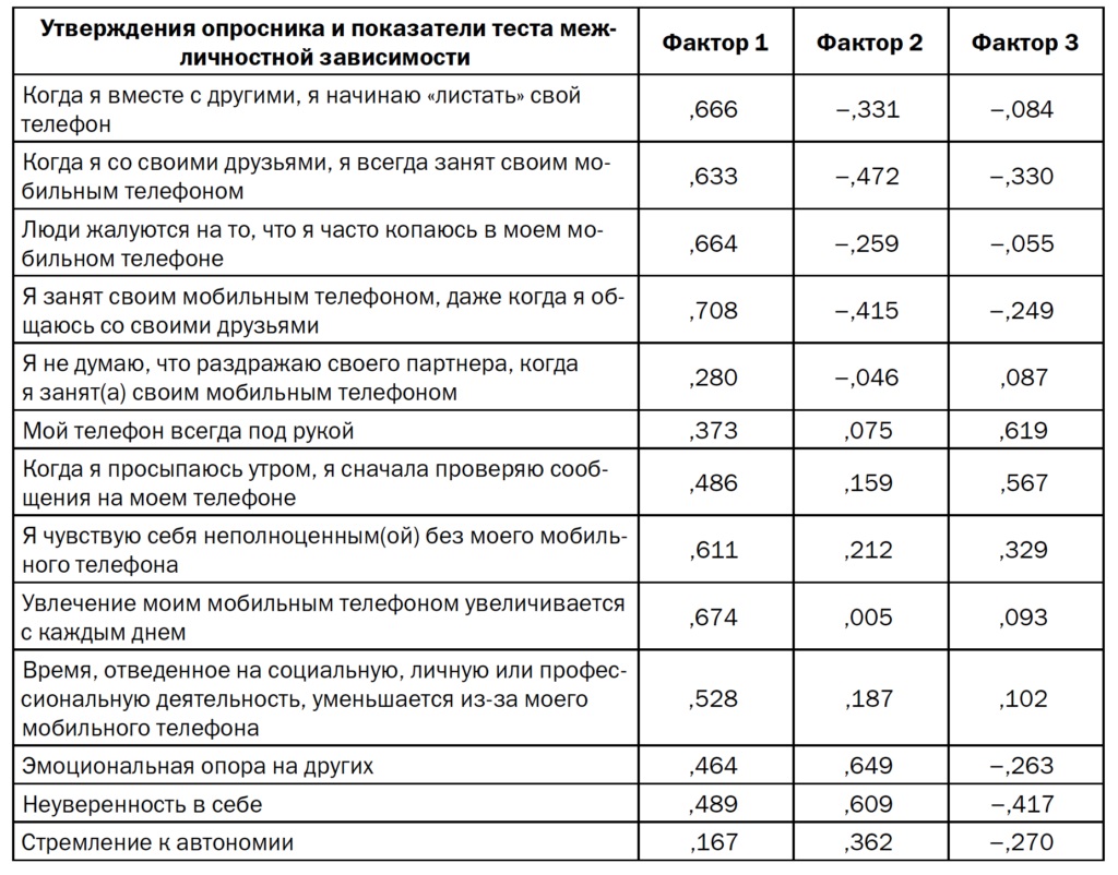 Второй фактор — фактор межличностной зависимости, напротив, показывает, что неуверенные в себе и зависимые люди не всегда используют гаджеты в качестве поведенческой защиты, поскольку последние не решают проблем общения.
