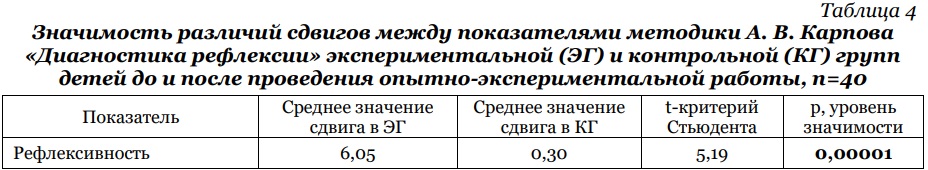 Исходя из результатов, полученных при сравнении изменений, произошедших во времени в экспериментальной и контрольной группах детей, можно говорить о том, что в искусственных так же, как и в естественных, условиях рефлексивность детей значимо выросла, что соответствует тому, что рефлексия в данном возрасте является одним из главных новообразований ребенка. Благодаря рефлексивности психика детей достигает уровня развития, необходимого для нормального перехода в подростковый период с его особыми возможностями и требованиями [2]. При этом анализ средних значений изменений в экспериментальной и контрольной группах показывает (табл. 2 и 3), что величина развития рефлексивности в группе детей, которая подвергалась экспериментальному воздействию, имеет более выраженный характер. Для определения значимости различий в средних значениях экспериментальной и контрольной групп было проведено межгрупповое сравнение сдвигов, полученных как разность результатов до и после проведения опытно-экспериментальной работы. Полученные результаты показывают, что положительные изменения рефлексивности у детей, входящих в экспериментальную группу (табл. 4), имеют значимый характер по сравнению с контрольной группой, что подтверждает, что разработанная программа повлияла на изменение в динамике развития рефлексивности детей младшего школьного возраста.