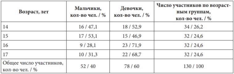 В исследовании принимали участие 130 подростков (52 лица мужского пола и 78 лиц женского пола) в возрасте от 14 до 17 лет. Все реципиенты являются учениками 9–11 классов средних общеобразовательных школ г. Москвы. По возрастным группам участники распределились следующим образом: 14 лет — 34 подростка (18 девочек и 16 мальчиков), 15 лет — 32 подростка (15 девочек и 17 мальчиков), 16 лет — 32 подростка (23 девочек и 9 мальчиков), 17 лет — 32 подростка (22 девочки и 10 мальчиков). Все испытуемые живут в полных семьях.