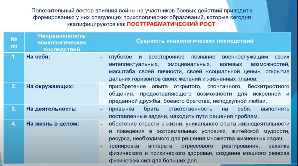 Положительный вектор влияния войны на участников боевых действий приводит к формированию у них психологических образований, которые сегодня квалифицируются как посттравматический рост, рассказал А.Г. Караяни. Он отметил, что последствия этого могут быть направлены на себя, на окружающих, на деятельность и на жизнь в целом, а также раскрыл сущность этих психологических последствий.