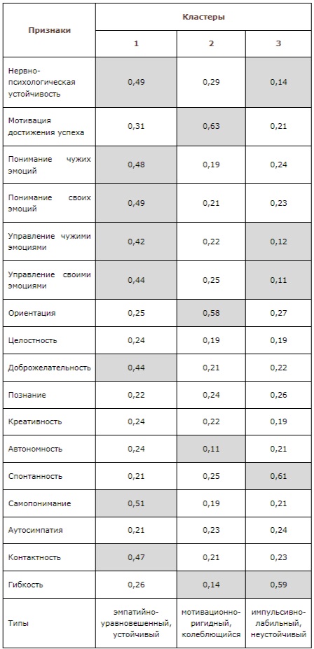 Таблица 1. Результаты кластерного анализа переменных, характеризующих типологию стрессоустойчивости сотрудников службы оказания психологической поддержки онкобольным