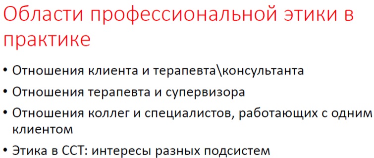 Понятно, что клиент приносит в терапевтическую ситуацию опыт своего совладания с проблемами, травмами, различные трудные переживания. И в этом смысле он оказывается в ситуации уязвимости. Терапевт тоже может все это приносить вместе с собой, это его личный опыт, который может быть проработан в разной степени. И в этом смысле он оказывается в некоторой ситуативной власти над клиентом. В этой ситуации клиент нуждается в безопасности, в принятии, чтобы продолжать работать, разбираться со своими трудными переживаниями. А консультант нуждается в эффективности, в защите от выгорания, в поддержании нейтральной позиции. И этим, на мой взгляд, объясняется, обуславливается необходимость тех этических принципов, которые мы продумываем, которым следуем. И периодически, наверное, их нужно обсуждать, особенно учитывая, что современная ситуация очень меняется. Существует несколько областей профессиональной этики. Я выделила четыре.