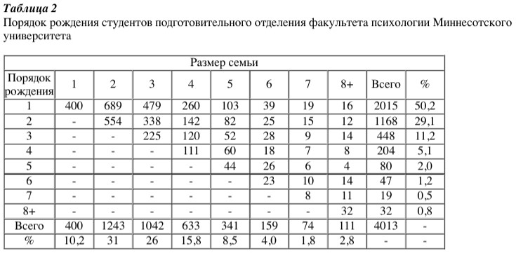 В одном из таких исследовании в 1959 и 1961 гг. были собраны данные о порядке рождения всех студентов подготовительного курса факультета психологии Университета в Миннесоте. Преобладающий возраст студентов — 19 лет. Данные представлены в таблице 2.