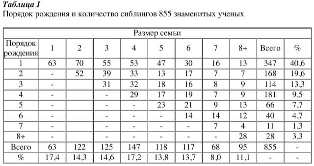 Как видно из таблицы 1, среди 855 ученых единственными детьми были 63 человека, первенцами — 277. Всего в этой выборке количество единственных и первых детей достигает 40,6%.
