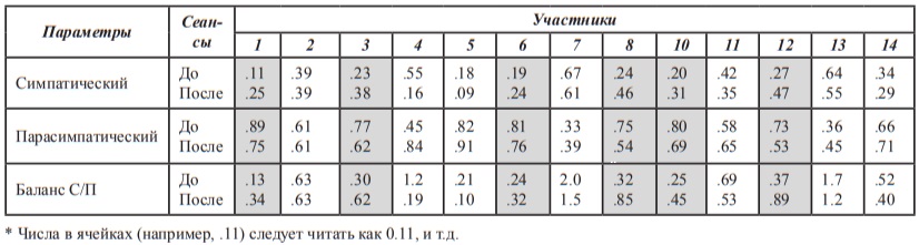 Средние величины параметров вегетативной регуляции для двух сеансов приведены в таблице 2. Изменения вегетативного баланса после коррекции наблюдались у всех участников, за исключением №2, у которого и электротонус менялся очень незначительно. Здесь также наметились две равночисленные группы участников. В одной из них баланс изменился в сторону симпатической регуляции (в таблице 2 эта группа выделена серой заливкой), в другой — в сторону парасимпатической.
