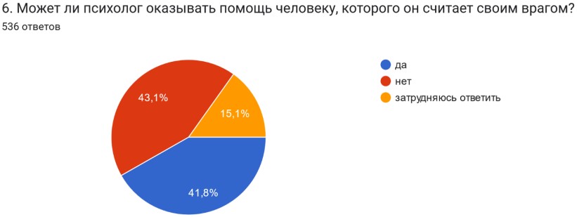 Получено 536 ответов: 43,1% опрошенных убеждены, что психолог не может оказывать помощь врагу; противоположного мнения придерживаются 41,8%; еще 15,1% затрудняются ответить.