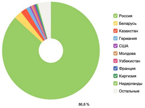 Географически аудитория распределена таким образом: 86,8% пользователей живут в России; в первую десятку по мере уменьшения доли пользователей вошли: Беларусь, Казахстан, Германия, США, Молдова, Узбекистан, Франция, Киргизия, Нидерланды (рис. 3).