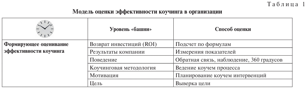 Лоуренс Уайт [31] разработали модель оценки организационного коучинга, которую назвали «Модель часовой башни для оценки коучинга первых лиц организации» (Clocktower Model of executive coaching evaluation, табл. 1).