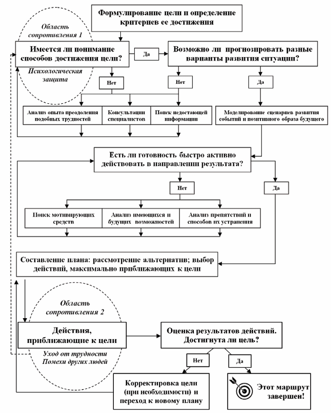 Маршрут движения к успеху можно представить в виде следующей схемы, описывающей этапы решения трудной жизненной задачи. Конечно, это не исключает неожиданных и нежелательных изменений ситуации, которые могут уводить в начало маршрута — как в настольной игре про путешествие, когда игроку выпадает значение, требующее возвращения на один из пройденных этапов. Тем не менее схема позволяет спланировать и продумать успешное достижение цели.