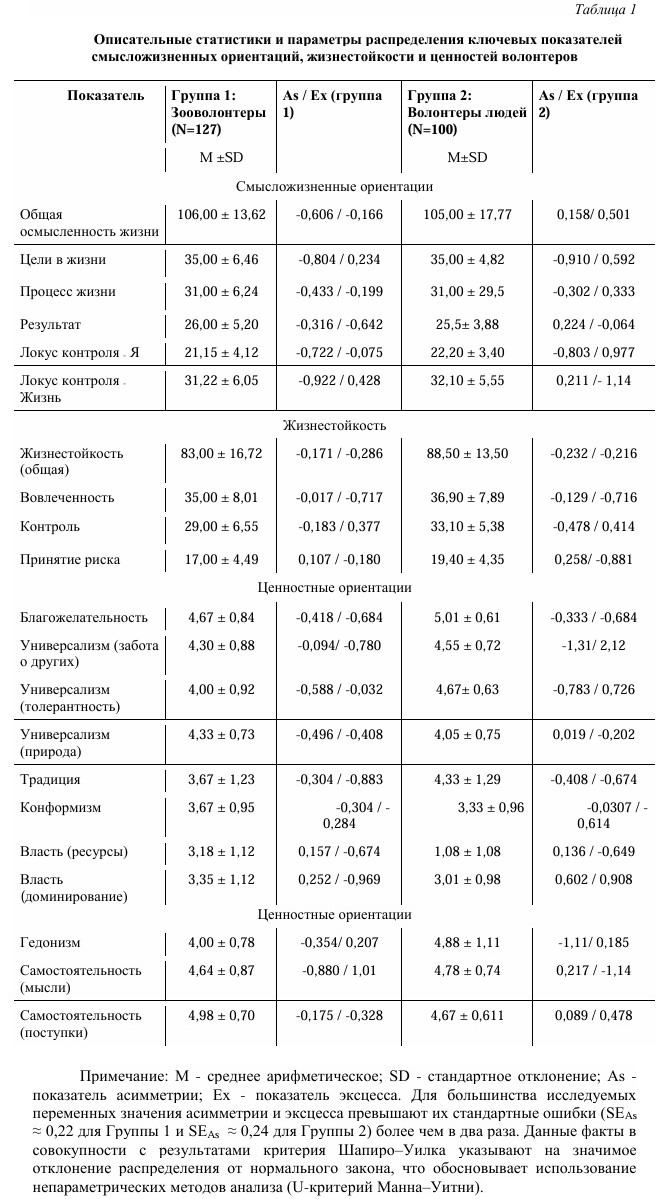 Первичный анализ включал комплексную проверку распределения показателей на нормальность с применением критериев Шапиро-Уилка, Колмогорова-Смирнова, а также оценку показателей асимметрии и эксцесса. Выявленные на всей выборке (N=227) статистически значимые отклонения от нормального закона (p < 0,05) и превышение показателями асимметрии и эксцесса их стандартных ошибок более чем в два раза подтвердили правомерность использования методов непараметрической статистики. Для сравнения групп по уровню выраженности исследуемых показателей применялся непараметрический U-критерий Манна-Уитни. В качестве меры размера эффекта использовалась рангово-бисериальная корреляция (rb). Анализ взаимосвязей внутри групп проводился с помощью коэффициента ранговой корреляции Спирмена (p). С целью сравнения силы корреляционных связей между двумя независимыми группами волонтеров применялось z-преобразование Фишера.