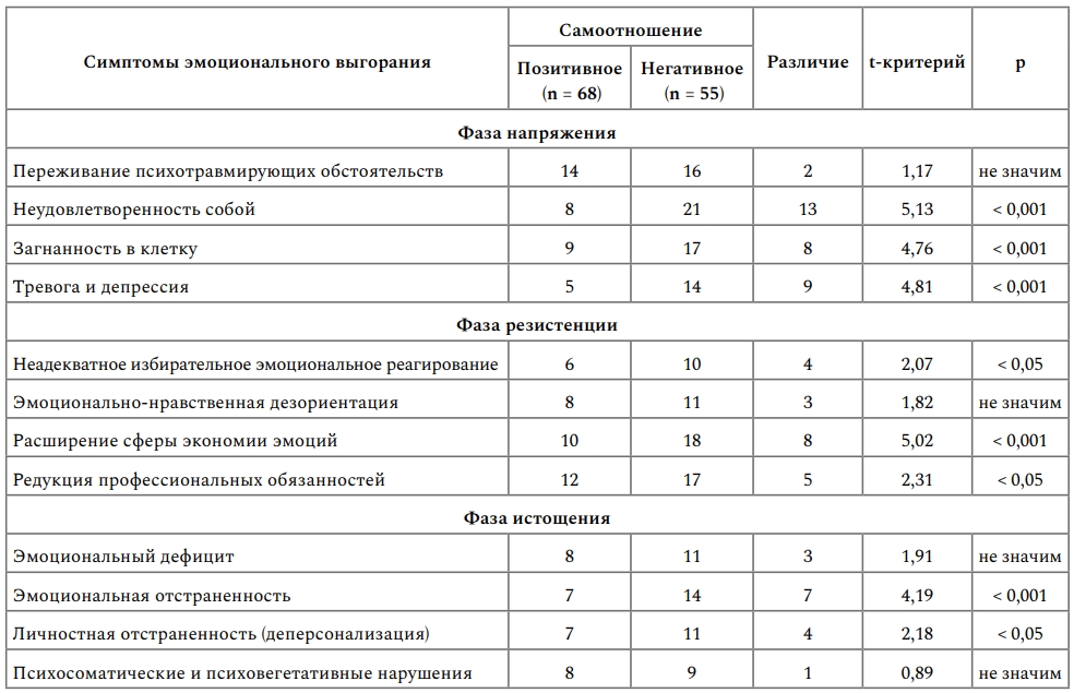 Результаты сравнительного анализа свидетельствуют о существенных различиях как в проявлении отдельных симптомов выгорания, так и в выраженности фаз у педагогов с разными показателями самоотношения. По таким симптомам, как неудовлетворенность собой, загнанность в клетку, тревога и депрессия, уровень значимости достигает p меньше 0,001 с доминированием показателей у педагогов с негативным самоотношением. В группе учителей с позитивным самоотношением в первой фазе только один симптом (переживание психотравмирующих обстоятельств) находится в стадии формирования, три других не сложились. В группе педагогов с негативным самоотношением в указанной фазе симптом тревога и депрессия находится в стадии формирования, тогда как оставшиеся три полностью сформировались.