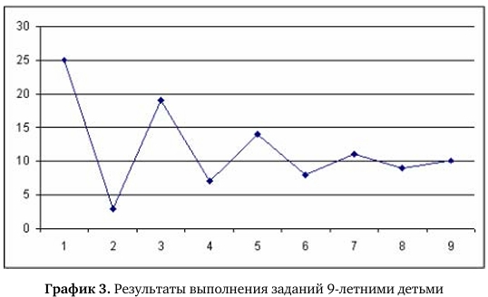 Проводя эксперименты с детьми младшего школьного возраста, мы обнаружили некоторые тенденции, принимающие характер определенной закономерности. Эксперименты проводились с детьми 5–6, 8 и 9 лет. В общей сложности нами исследованы три выборки испытуемых дошкольного и младшего школьного возраста. Объем отдельной выборки состоял из 50 испытуемых. Детям предлагалось 10 заданий на решение однотипных задач на обобщение. В каждом задании предъявлялось 20 геометрических фигур, 5 из которых имели общие признаки, а оставшиеся 15 выступали в качестве «фоновых». Время, за которое ребенку предлагалось отыскать фигуры, подлежащие объединению, и произвести соответствующее обобщение, фиксировалось. Напомним, что предлагаемые задачи были однотипными, т.е. если в одной серии ребенок производил обобщение с треугольниками, то в другой — с квадратами или ромбами. При изменении последовательности предъявления заданий мы обнаружили неизменность результатов по фиксируемому времени выполнения, что подтверждает однотипность задач эксперимента.