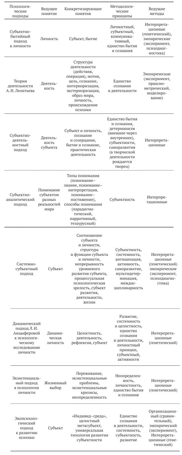 Приведенные представления разных авторов о возможности интеграции (В.А. Мазилов, В.А. Янчук) или возможности сравнения научных подходов (Е.А. Сергиенко, А.В. Юревич) позволили нам выбрать некоторые ориентиры в попытке представить пространство психологической науки как дифференцированное разными теориями, так и взаимосвязанное через открытость границ и гибкость понятийных структур. Еще одна перспектива — сравнительные характеристики современных, центральных (ведущих) понятий в психологических подходах, понятий, конкретизирующих ведущее понятие, а также выделяемые методологические принципы. Кроме того, в схему сравнения мы добавили ведущие методы, характерные для разных подходов. В данных координатах проанализируем субъектно-бытийный подход к личности.