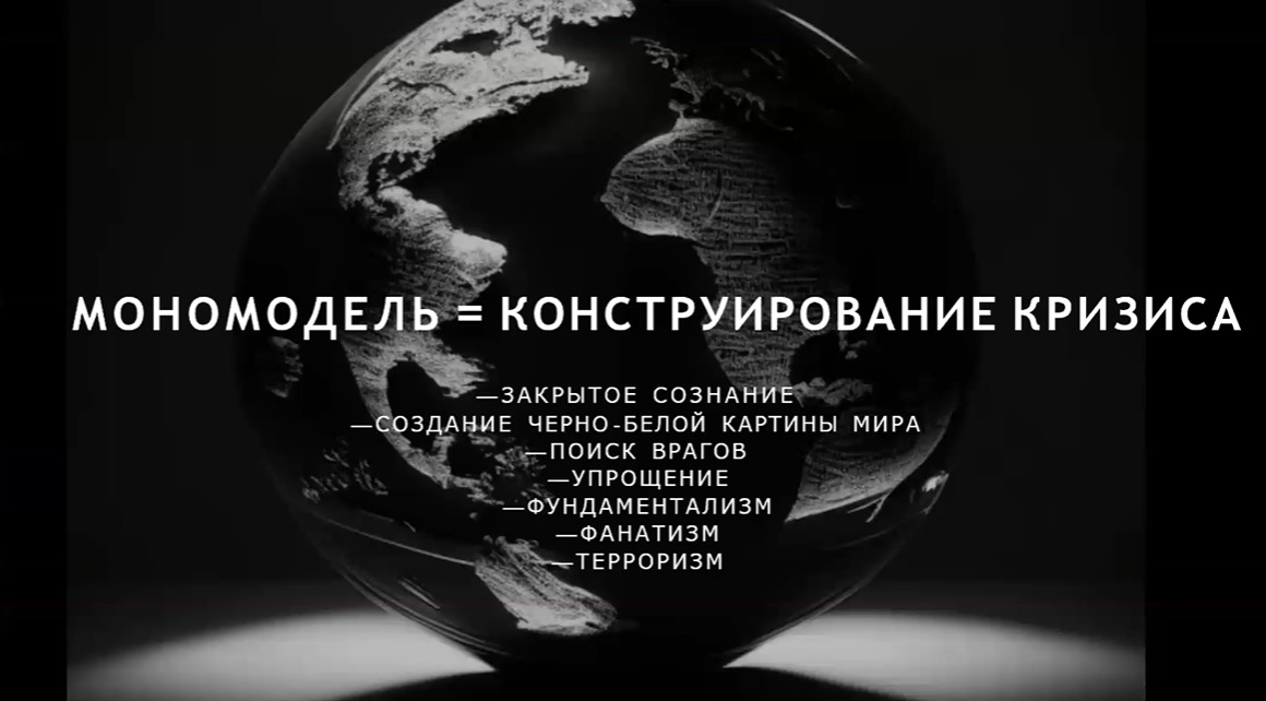 Мы сталкиваемся с мономоделями конструирования кризиса. За ними — закрытое сознание, создание черно-белой картины мира, поиск врагов, упрощение, фундаментализм, фанатизм, терроризм.