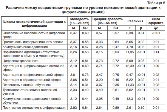 Сравнительное изучение возрастных особенностей психологической адаптации личности к цифровизации в различных социальных сферах в молодости и средней зрелости было направлено на выявление различий по шкалам психологической адаптации и особенностям ценностного сознания (табл. 8).