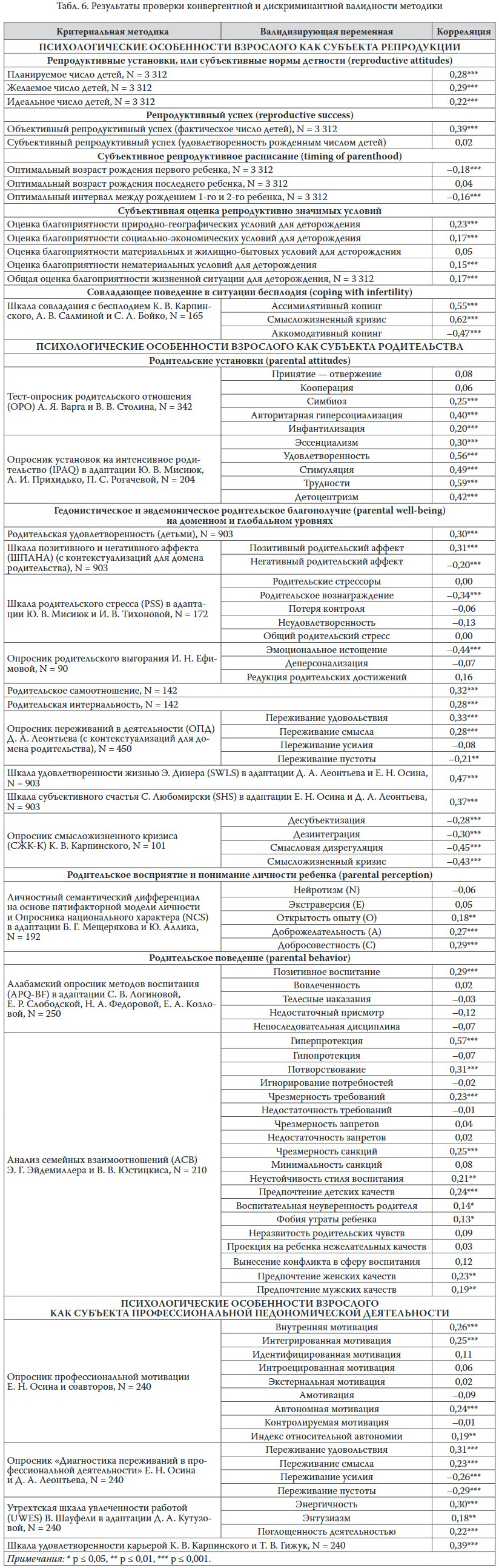 Конвергентная и дискриминатная валидность определялась путем выявления наличия, силы и направленности корреляционных связей между диагностическим показателем методики и индивидуально-психологическими особенностями испытуемых как субъектов репродукции, родительства и профессионального педономического труда (Карпинский 2023; 2024а; 2024b; Салмина и др. 2024). Все эти особенности функционируют в качестве психических регуляторов различных видов поведения и деятельности взрослого, объектом которых выступают дети, и в этой связи могут считаться валидизирующими переменными для диагностического показателя создаваемой методики. Выявленные паттерны корреляций доказывают конструктную валидность и убеждают в том, что ценностное отношение к детям действительно образует скрытый диагностический конструкт методики (табл. 6).