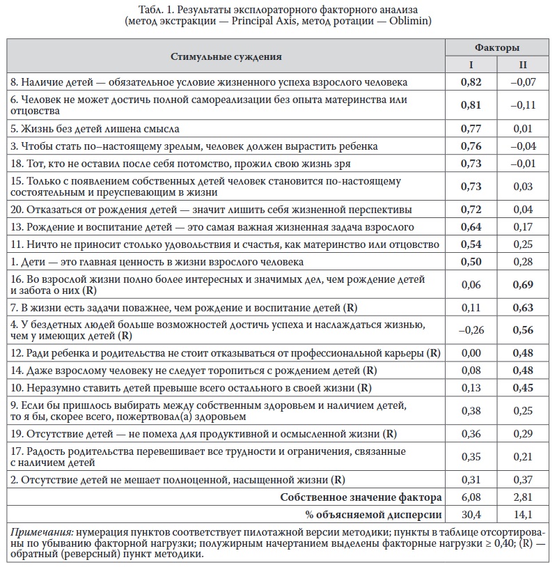 Визуальная инспекция факторной структуры приводит к выводу, что раскладка пунктов по факторам имеет под собой скорее формальное, чем содержательное основание. Первый фактор объединяет прямые суждения, тогда как второй — обратные утверждения. Если бы инверсные пункты отражали качественные особенности негативного терминального смысла (антиценности) детей (к примеру, категорическое неприятие деторождения и родительства, детоненавистничество, антигуманные предубеждения в отношении детей и т.п.), то второй фактор можно было бы рассматривать в качестве самостоятельной субшкалы, измеряющей психологический антипод позитивного терминального смысла (ценности) детей. Однако в нашем случае обратные суждения сформулированы как отрицание тех проявлений, которые свойственны ценностному отношению к детям, и по этой причине могут трактоваться лишь как индикаторы низкого уровня выраженности этого отношения.