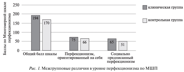 Сравнение клинической группы с нормой (рис. 1) показывает, что в норме общий балл опросника Многомерная шкала перфекционизма (МШП) и балл по подшкалам (ПОС — перфекционизм, ориентированный на себя, — предъявление изнурительных, избыточных требований к самому себе; СПП — социально предписанный перфекционизм — ощущение навязанных высоких стандартов, завышенного уровня требований со стороны других) значимо ниже (p < 0,05 по критерию Стьюдента).