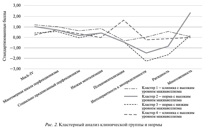 Кластерный анализ позволил разделить всех участников исследования на четыре группы по ключевым параметрам: выраженность манипулятивных установок и принадлежность к клинической группе или к норме (рис. 2).