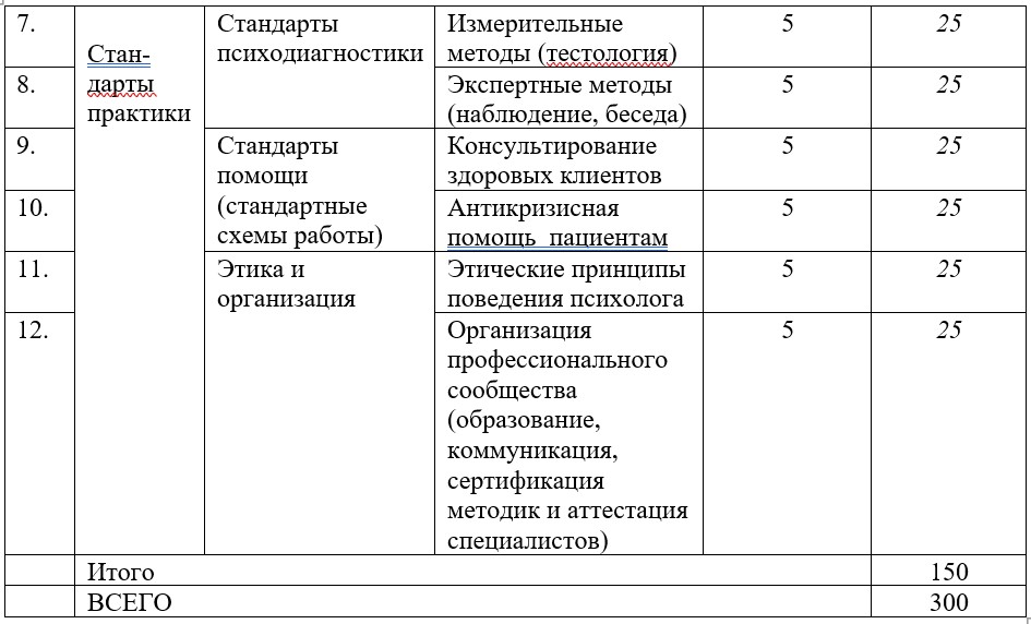 Во-первых, стандарты подготовки психологов. Приведенный вами перечень дисциплин для оценки доступен не во всех вузах до сих пор к сожалению. Очень вольно трактуется как сам набор дисциплин так их наполнение. Учебники, смею заметить, тоже разнообразны. Мне кажется важным еще раз провести стандартизацию учебных программ и выработать единые требования к подготовке психологов.