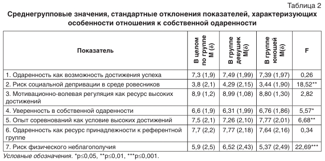 Проверка значений факторов на нормальность распределения показала, что факторы «Одаренность как возможность достижения успеха», «Одаренность как ресурс принадлежности к референтной группе» имеют распределения, отличные от нормального со сдвигом в сторону более высоких значений. Это позволяет предположить их дифференцирующий статус для подростков с академической, спортивной и лидерской одаренностью. В табл. 2 представлены среднегрупповые значения и стандартные отклонения показателей, характеризующих особенности отношения к собственной одаренности в целом по выборке, а также с учетом пола респондентов. В связи с тем, что каждый фактор включает разное количество переменных, вычисление среднегрупповых значений проводилось по усредненным показателям для каждого фактора, в итоге диапазон возможных оценок по каждому параметру находится в пределах от 1 до 10.