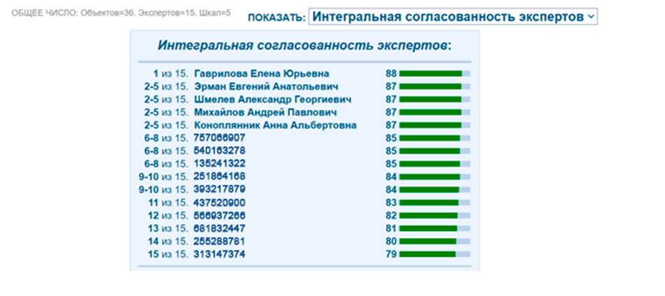 На скриншоте 1 вы видите, как был построен рейтинг согласованности экспертов на материале нашего конкурса кейсов в практическом курсе «Психологическая и общая теория конкуренции». Первая пятерка самых согласованных экспертов включает участников клуба «Эльбрус» — победителей конкурса «Лидеры России». По правилам игры мы не разглашаем при этом ФИО тех участников конкурса экспертов, которые НЕ показали высоких результатов — не вошли в первую пятерку. Каждый участник сам видит свой результат, но только под ИД-номером, а ключ к этому ИД-номеру является конфиденциальным, то есть его не знают другие участники конкурса. Такая конкурсная технология из жесткой отборочной (организационной) превращается по факту в «консультативную» (см. об этом различении мою предыдущую статью на блоге «Про терминологический пофигизм…»).