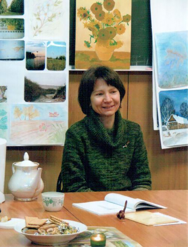 Юлия Валерьевна Позднякова — художник, педагог Московского НИИ психиатрии (рис. 17), проводит занятия с использованием приёмов ТТСБ и ХК с детьми и подростками [108]. В работу берутся уже известные, ранее написанные психотерапевтические рассказы автора метода ТТСБ М.Е. Бурно, многолетних творчески продуктивных участников групп — А.С. Соколова, А.А. Капустина и др. Юлия Валерьевна подготавливает для ребят особые психотерапевтические сказки. Немало она написала психотерапевтических рассказов, очерков, стихов и для взрослой аудитории: В детстве [111, с. 58–59]; Весна в Южной Карелии [142, с. 47–51]; Воспоминание об Истье [45, с. 12–13]; Карелия. Палье‑озеро [103, с. 25–27]; Каток из детства [138, с. 15–16]; «Маленькая пристань у пруда…» [58, 46–47]; «Маленькой, родители часто возили меня в Ярославль…» [138, с. 17]; «Малыш шагает…» [104, с. 5; 110, с. 705–706]; «На работе…» [58, с. 45]; Напрасные стихи [104, с. 7–8; 110, с. 381]; Несерьёзно (О любви?) [104, с. 6; 110, с. 380]; О целебном общении с живописью [110, с. 637–639]; Осеннее [104, с. 7; 110, с. 380]; Оттепель [107, с. 36–37]; Радуга [113, с. 10]; Рождество в Ярославле [130, с. 44–46] — этот искренний самобытный рассказ автора лёг в основу одного из психотерапевтических занятий в духе Терапии творческим самовыражением М.Е. Бурно и Характерологической креатологии (ТТСБ и ХК), которое мы проводим в группе «Психологическое здоровье»; «Сейчас возвращаюсь домой…» [110, с. 745]; У метро [107, с. 37–38]; «У родника по камушкам…» [113, с. 9–10]; У Тамары [58, 45‑46]; «Я вымаливаю у природы жалостно…» [104, с. 5–6; 110, с. 706].