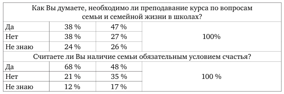 Основным методом выступил сопоставительный анализ частот ответов на вопросы анкеты. Была проанализирована специфика ответов на вопросы «Как Вы считаете, нужно ли готовить человека к созданию семьи через обучение семейным ценностям?», «Верно ли высказывание “Семья — основа любого государства, не будет семьи — не будет государства”?», «Хотите ли Вы, чтобы Ваша будущая семья была похожа на ту, в которой Вы выросли?», «Как Вы думаете, необходимо ли преподавание курса по вопросам семьи и семейной жизни в школах?», «Считаете ли Вы наличие семьи обязательным условием счастья?», «Как вы относитесь к гражданским бракам?», «Как вы относитесь к рождению детей вне зарегистрированного брака?», «Хотите ли Вы в будущем создать семью?», «Что, по-Вашему, является основной причиной создания семьи?», «Каковы главные условия благополучного брака?». Категории ответов на каждый из указанных вопросов представлены в табл. 3.1–3.5.