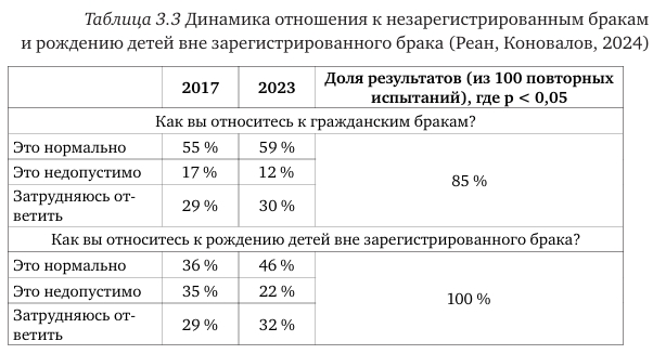 Касательно вопроса отношения к гражданским бракам также существует некоторая тенденция к «нормализации» указанного явления, однако различия в распределениях по категориям не столь велики, а также результаты повторных испытаний не являются устойчивыми, хоть и выявлен значительный процент положительных результатов (табл. 3.3).