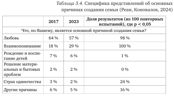 По результатам сопоставительного анализа с повторными испытаниями в ответах на вопрос «Что, по-Вашему, является основной причиной создания семьи?» выявлено два значимых изменения: в 2023 году респонденты значимо реже выбрали вариант «Любовь» (57% — по сравнению с 64% в 2017) и значимо чаще — «Взаимопонимание» (29% против 18%). Оба результата являются устойчивыми. Остальные варианты ответов имеют сходные распределения.
