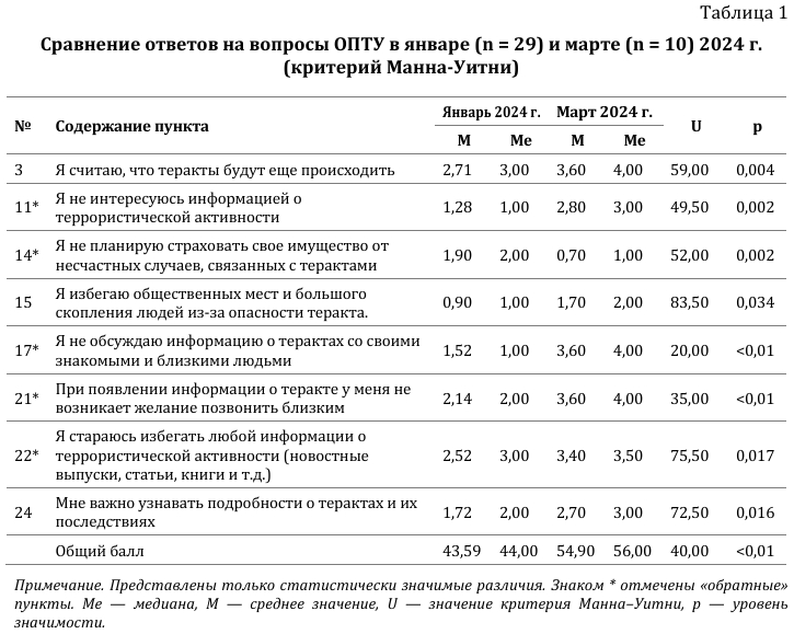 Социально-демографическая гомогенность групп позволила нам провести сравнение данных, полученных в январе и после марта 2024 г., как показателей переживания террористической угрозы до и после теракта.