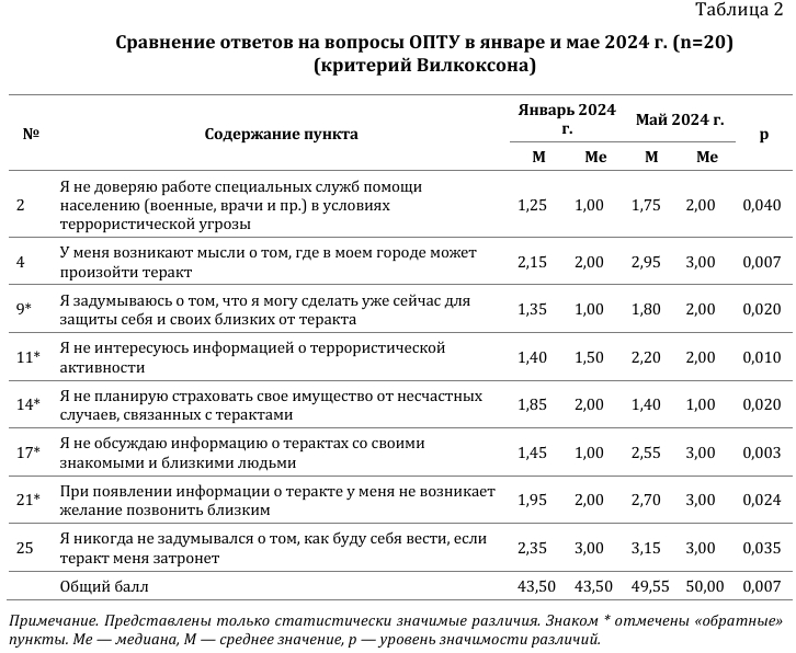 2. Для проверки предположения о том, что различия, выявленные в некоторых аспектах переживания террористической угрозы, могут быть обусловлены когортными различиями и не связаны с произошедшим терактом, в мае 2024 г. было проведено повторное обследование группы респонденток, принявших участие в исследовании в первый раз в январе 2024 г. Результаты сравнения ответов по пунктам методики ОПТУ представлены в таблице 2.