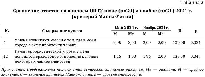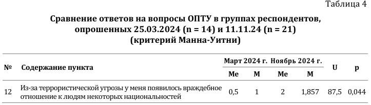 4. Далее был проведен сравнительный анализ по пунктам и общему баллу ОПТУ между двумя временными замерами: 25.03.2024–31.03.2024 и 11.11.2024, т.е. спустя несколько дней и 8 месяцев после теракта 22 марта 2024 г. Для сравнения были отобраны респонденты двух временных срезов, уравненные по возрасту (от 21 до 26 лет). Данные по выделенным статистически значимым различиям представлены в таблице 4.