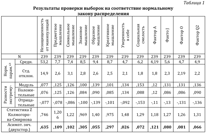 Результаты исследования. Проверка данных на соответствие нормальному закону распределения показала, что этому требованию удовлетворяет лишь половина из них (табл. 1).