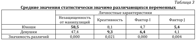 Данные, представленные в таблице 3, показывают, что юноши защищены от манипуляций в меньшей степени, чем девушки. Это дополняет полученный ранее вывод о том, что взрослые женщины в некоторой степени лучше взрослых мужчин защищены от манипуляций [22, с. 153]. Таким образом, факт лучшей защищенности от манипуляций представительниц женского пола теперь можно считать установленным не только для взрослых, но и для подростков. Девушки в нашей выборке более креативны и более сензитивны (фактор I), чем юноши, при этом юноши показывают большее значение по фактору J (неврастения).