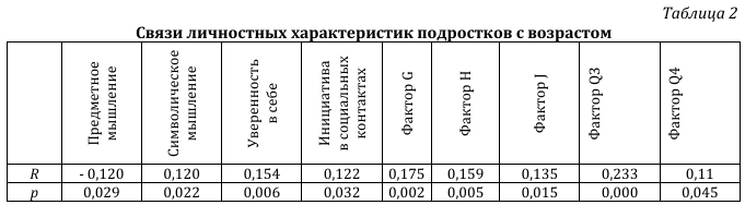 Данные таблицы 2 показывают, что у всех приведенных в ней личностных характеристик подростков наблюдается увеличение их выраженности с возрастом, что вполне объяснимо. Исключение составляет предметное мышление, уровень которого с возрастом «снижается» (по-видимому, за счет возрастания символического мышления).