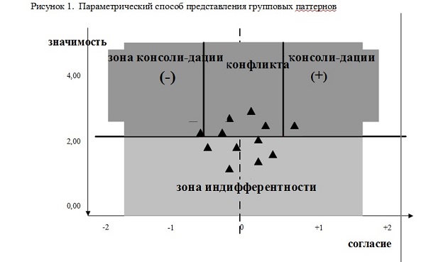 Очевидно, что при таком способе представления результатов показательной становится сама форма распределения. Так, форма «бычьей головы» указывает на то, что группа респондентов имеет высокую степень согласия по наиболее важным для них вопросам. Приближение распределения к куполообразной форме или «голове носорога» свидетельствует о конфликтной ситуации, когда по наиболее важным вопросам мнения членов группы резко расходятся. Приближение распределения к виду малого и плотного облака, центрированного вокруг точки пересечения средних значений общего балла и ИЗ, свидетельствует об отсутствии повторяющихся ценностно-мировоззренческих паттернов в исследуемой группе. Приближение к форме галочки – о ситуации полного единомыслия. Степень «нагруженности» зоны конфликта, отражающая уровень существующего между респондентами разногласия по значимым для них вопросам, может быть численно выражена показателем конфликтности паттерна.