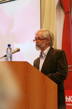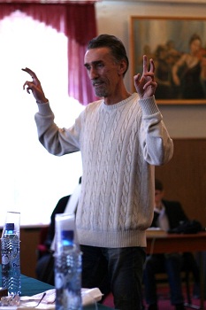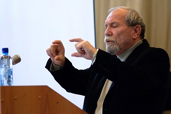 А.П. Назаретян начал своё выступление с красивой цитаты из поэмы М. Волошина «Путями Каина»: «В начале был мятеж, Мятеж был против Бога. И Бог был мятежом…». Используя мультимедийную презентацию, говорил о психологических и духовных практиках, упоминал о социальном насилии и морали. «Степенью познания является степень самоотказа. Я избегаю в своих лекциях слово «сознание», т.к. оно слишком многозначно, и предпочитаю слово «интеллект»». Прозвучал термин «коэффициент кровопролитности» и интересный факт, что на сегодняшний день в мире насилие достигло небывало низкого уровня, что самоубийств раза в полтора больше, чем убийств, в Евросоюзе ещё больше, и в России - ещё больше. Т.е. физическое насилие снижается, но есть ещё виртуальное насилие, и оно выталкивается с экранов телевизоров, компьютеров. Идеал моральности – первобытный охотник. А сейчас – даже церковь приспосабливается к современным требованиям, настроениям. Интеллект в настоящее время решающим образом зависит от смыслообразования.