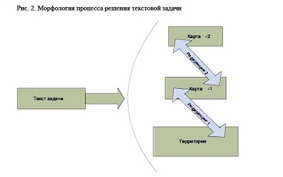Возможно, существуют задачи, которые решаются посредством карты-1. Однако чаще всего такой структуры недостаточно для решения. Чтобы справиться с большинством известных проблемных ситуаций, необходимо провести еще одно картирование: отталкиваясь от карты-1, произвести референцию-2 и построить карту-2 (см. Рис. 2). В более привычных терминах можно сказать, что на основании текста задачи решатель строит ее модель или у него появляется ее репрезентация (о различиях между этими понятиями и картой-2 см. ниже).
