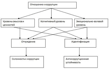 Склонность к коррупции и антикоррупционная устойчивость – могут быть поняты через призму отношения к коррупции. На рисунке 1 изображена структурная модель отношения к коррупции. Как склонность к коррупции, так и антикоррупционная устойчивость определяются через ценностный, когнитивный и эмоционально-волевой уровни отношения к коррупции, которые в свою очередь через механизмы «отчуждения» и «идентификации» приводят соответственно либо к склонности к коррупции, либо к антикоррупционной устойчивости.