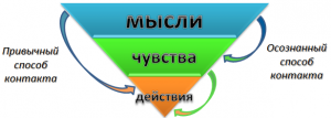 Когда я только начала учиться гештальт-терапии, меня удивило даже само слово «выбираю отреагировать». Как так? Но именно так — не дядя же Вася из соседнего подъезда сказал хаму: «Отвали козел». А есть же масса вариантов: промолчать, отвернуться и уйти, попросить перестать хамить и т.д. Это банальный пример, но механизм остается таковым в любых ситуациях – мы выбираем. Наши реакции в момент контакта с другим человеком включают целый спектр ощущений, чувств и эмоций до того как нам приходит мысль отреагировать тем или иным образом. Фактически все это мы это делаем автоматически, переходя от мысли к действию. Этот процесс, условно, можно описать вот такой схемой: