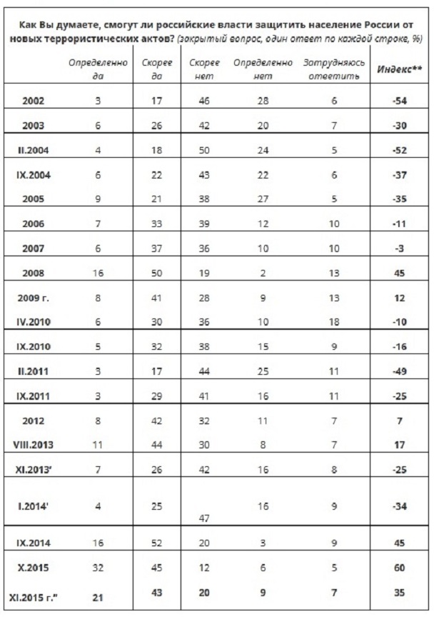 Нынешнее значение (50 п.) близко к показателю января 2014 г. (51 п.) – когда в памяти граждан были свежи впечатления от теракта в Волгограде. Динамика зафиксирована на фоне роста доли тех, кто опасается стать жертвами терактов (с 65% до 72% опрошенных) и снижения доли тех, кто старается не задумываться над этим вопросом (с 18% до 12%). Убежденность в том, что ни им, ни их близким ничего не угрожает, сегодня выражают 15% опрошенных (в октябре – 16%).