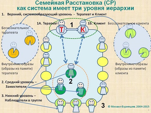 Второй уровень расстановочной системы – это заместители, именно на заместителей клиент осознанно и направленно смещает роли (мать, отец, клиент и т.д.) и образы отношений в семье, роду, организации, из разных областей своей памяти (бессознательного или души). Заместители, на которых клиентом смещены определенные роли и образы отношений, могут почувствовать и описать феномены этих ролей и их можно наблюдать в пространстве расстановки как в зеркале. С помощью заместителей в расстановке можно видеть содержание определенных областей (слоев) бессознательного (памяти) клиента. Сам феномен смещения или переноса ролей и чувств давно известен в жизни, он хорошо изучен и используется в психоанализе, но там перенос происходит неосознанно и специально не направляется на психоаналитика. В системной расстановке мы используем осознанный (т.к. клиент осознаёт роль, которую он смещает на заместителя), направленный (т.к. роль смещается на конкретного заместителя), добровольный (т.к. сам заместитель добровольно предоставляет клиенту возможность сместить на него определенную роль), групповой (т.к. смещение происходит не на одного человека, а на группу заместителей) перенос или смещение.