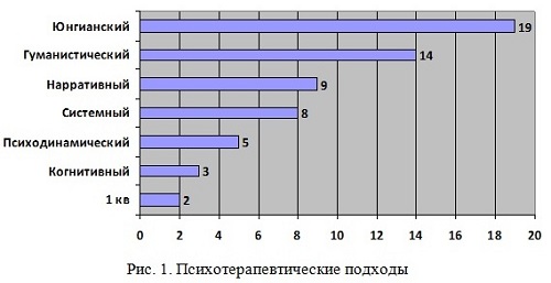 Юнгианский подход в психотерапии выделяется как часто используемый. «Другие» ответы дали 8 терапевтов. Трое назвали терапевтическое использование кукол. Были названы гипнотерапия и психосинтез.