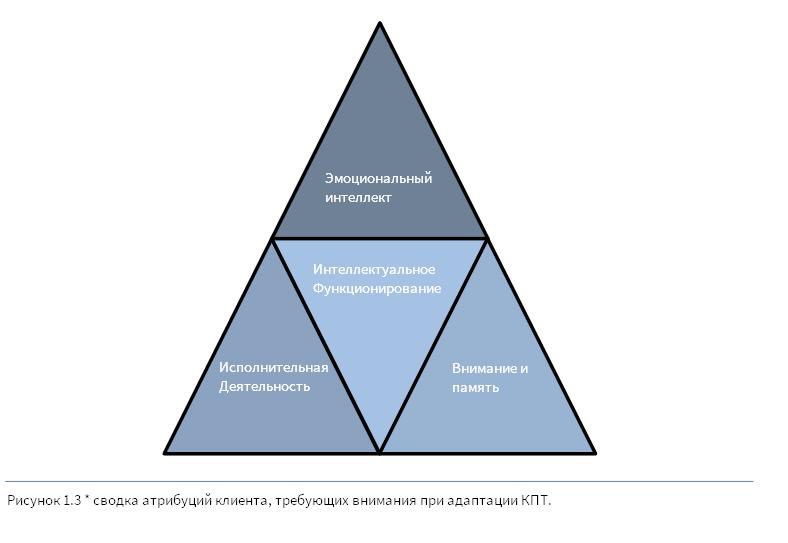 КПТ предлагает клиентам отслеживать и анализировать свои мыслительные процессы, такие как избирательное внимание, предвзятость (необъективность) памяти, и другие потенциально дисфункциональные пути формирования их переживаний. Таким же образом, выявление и оценивание убеждений о мыслях и мыслительных процессах (т.е. мета-когниции) требуют определённых аспектов интеллектуального функционирования, таких как рецептивный и экспрессивный язык, и способность к абстрактному мышлению (Sasso & Strunk, 2013; Waters, Mogg, & Bradley, 2012). Клиенты с низким уровнем интеллекта, проблемами грамотности, с алкогольным синдромом плода, синдромом дефицита внимания и гиперактивности, психозами, или имеющие в анамнезе черепно-мозговые травмы или чрезмерное употребление алкоголя или наркотиков, или те, кто может испытывать начало деменции, будут нуждаться в особой чувствительности терапевта и навыках использования КПТ. (см. рис. 3).