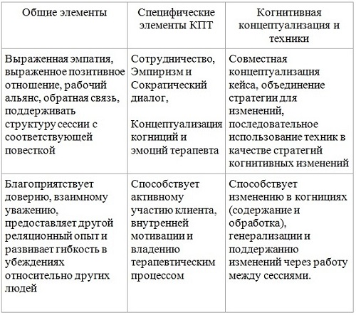 Таблица 1. Резюме специфических действий терапевта и предполагаемый результат общих и специфических для КПТ элементов терапевтических отношений