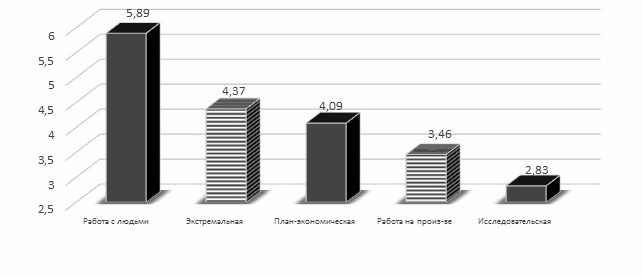 Из рисунка 3 видно, что преобладающей профессиональной склонностью у современных старшеклассников является склонность к работе с людьми (среднеариф. значение 5,89), далее по степени уменьшения: экстремальные профессиональные склонности (среднеариф. значение 4,37), планово-экономические профессиональные склонности (среднеариф. значение 4,09), склонность к работе на производстве (среднеариф. значение 3,46), и менее выражена исследовательские профессиональные склонности у старшеклассников (среднеариф. значение 2,83).