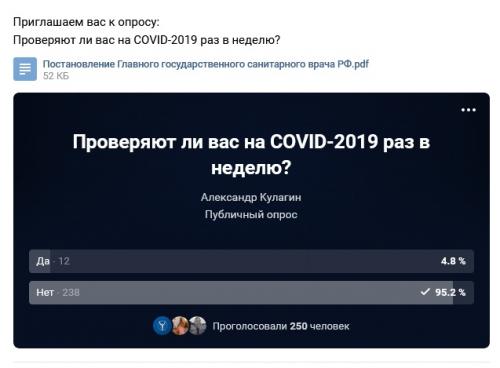 Учитывая то, что медицинский психолог продолжает свою работу со всеми категориями пациентов и риск заражения есть всегда, вышеуказанное Постановление имеет прямое отношение к специалистам на местах, работающих в бюджетной системе здравоохранения РФ. Ассоциация на своей официальной странице в социальной сети ВКонтакте организовала опрос среди специалистов «Проверяют ли вас на COVID-2019 раз в неделю?» из 250 участников только 12 человек ответили утвердительно.