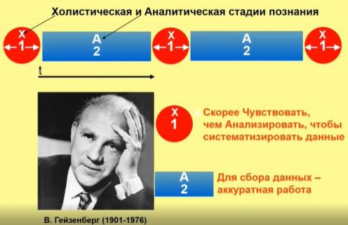 Могут быть выделены холистическая и аналитическая стадии познания (1 Х и 2 А на рис. 26). Гейзенберг говорил, что на одной стадии (1 Х) мы скорее чувствуем, чем анализируем, а на второй (2 А) начинаем анализировать и аккуратно собирать данные.